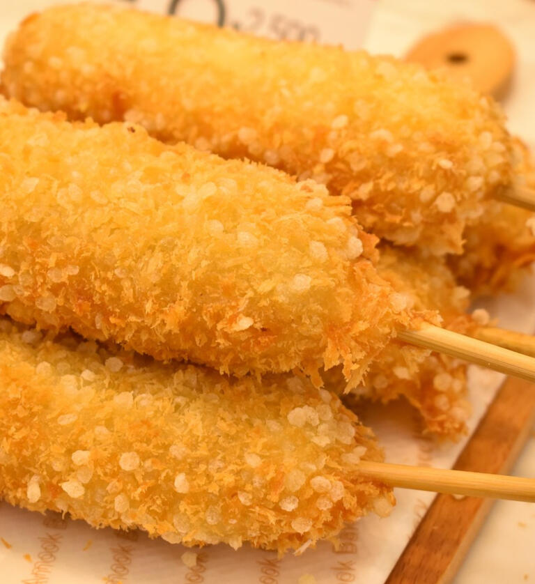 Crispy potato-crusted corndog stuffed with gooey mozzarella cheese, fried golden, and finished with your choice of mustard, mayo, or ketchup.